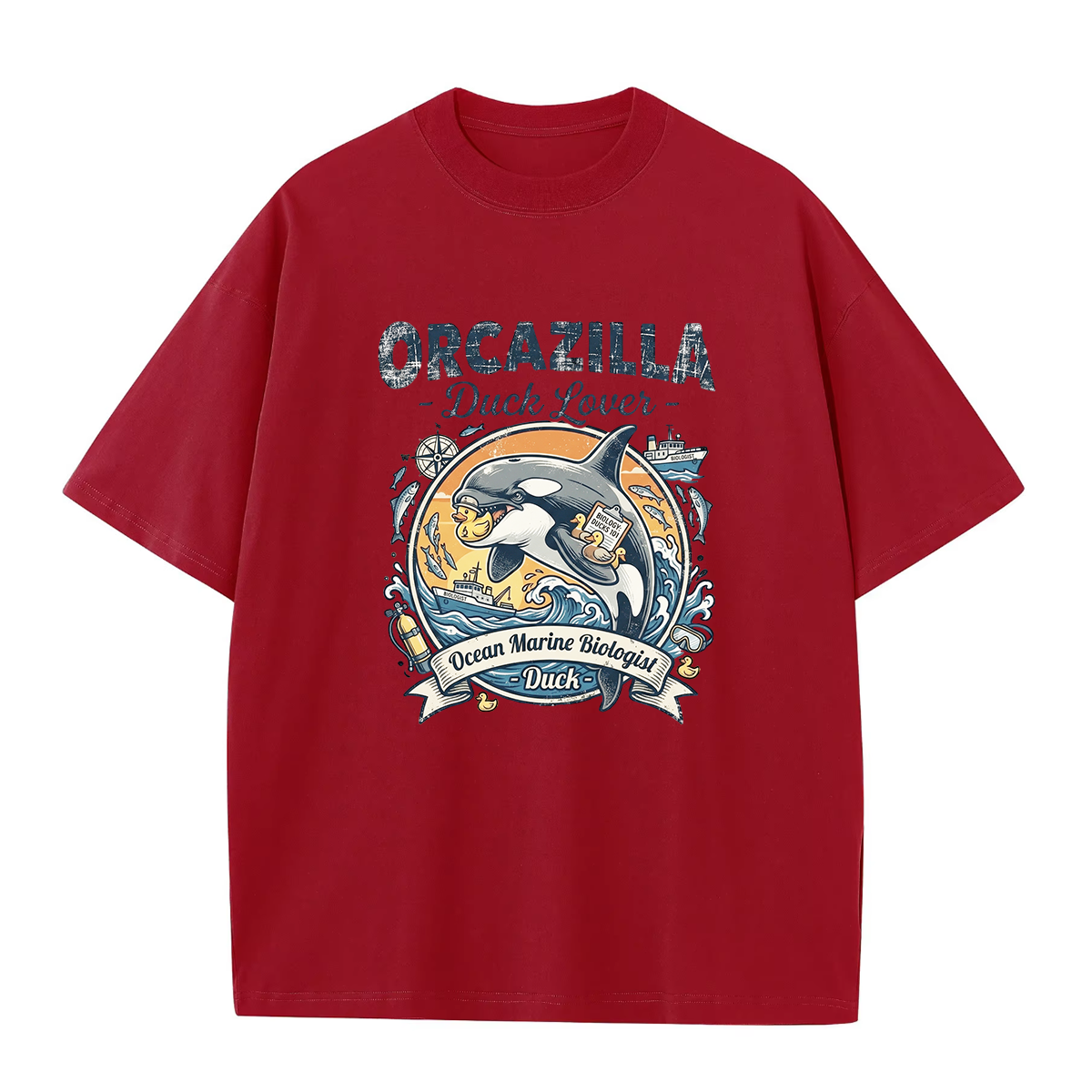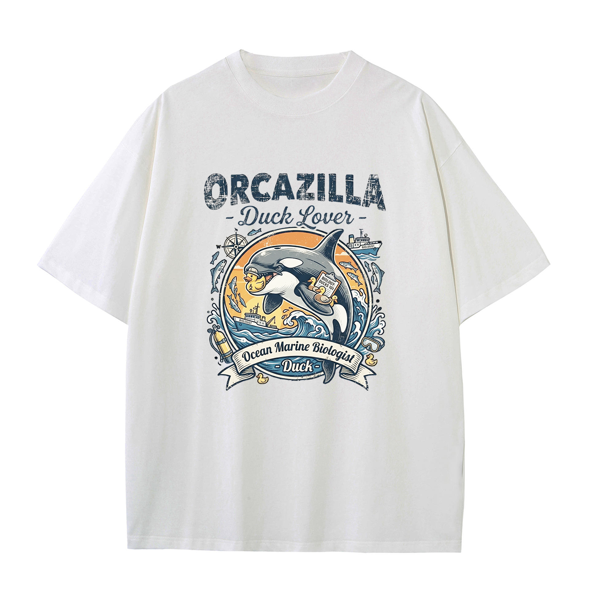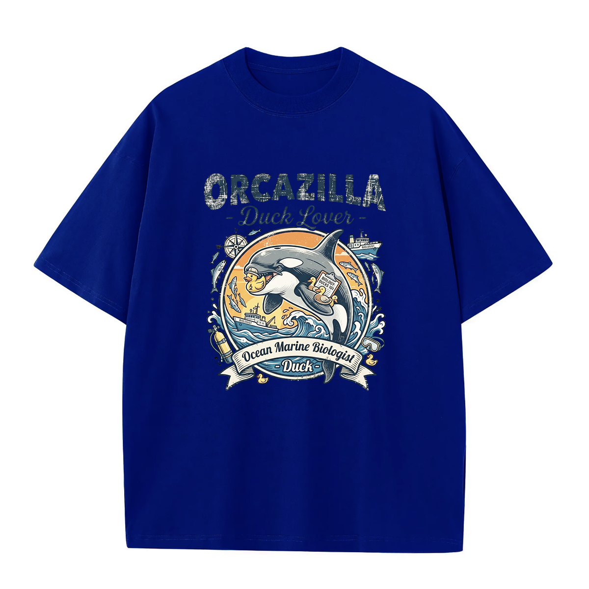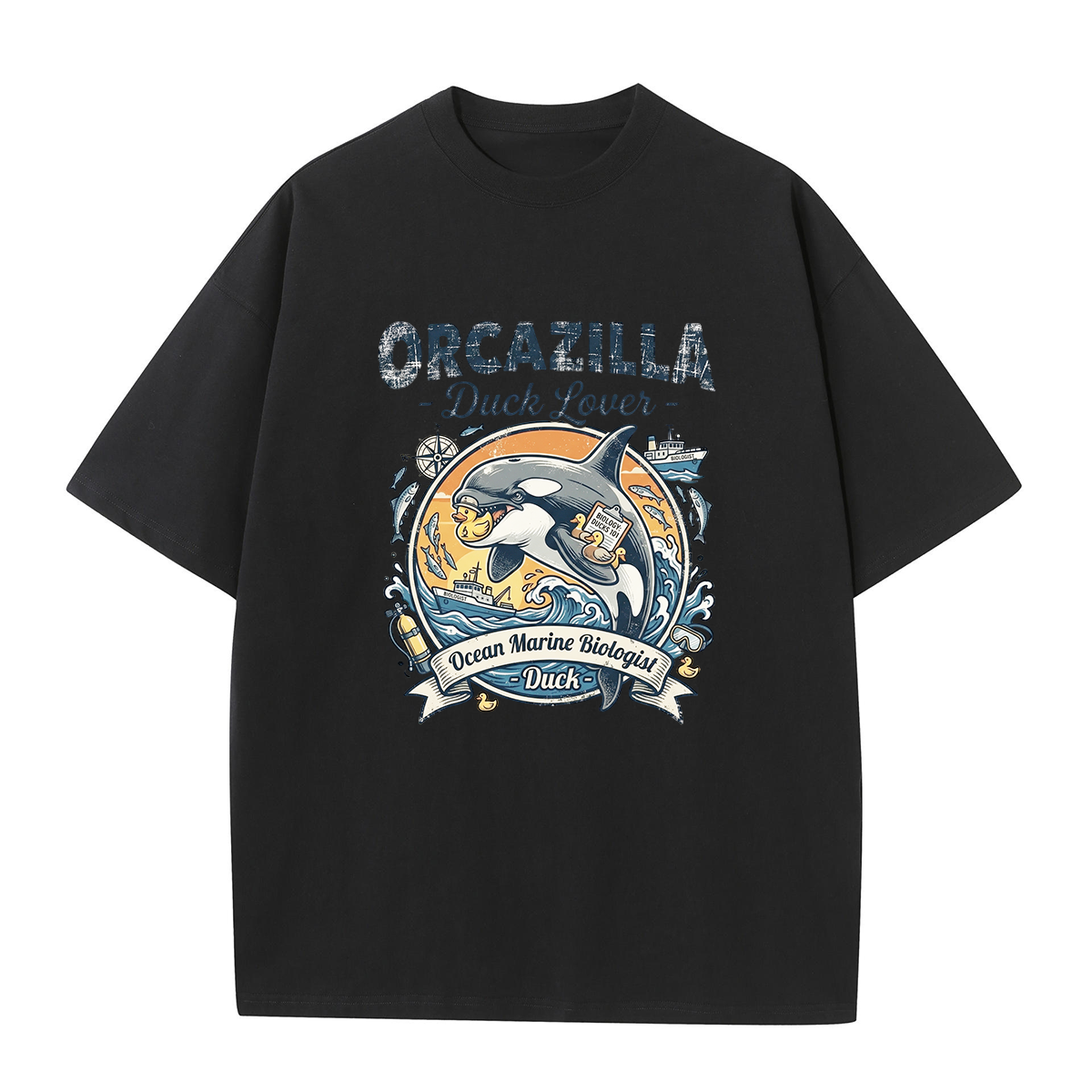 Make a bold and playful statement with the “Orcazilla” graphic t-shirt. Combining ocean power with quirky humor, this unique design blends a giant orca-inspired concept with a fun duck lover twist—perfect for marine biology enthusiasts, ocean lovers, and anyone who enjoys creative, standout graphics.
